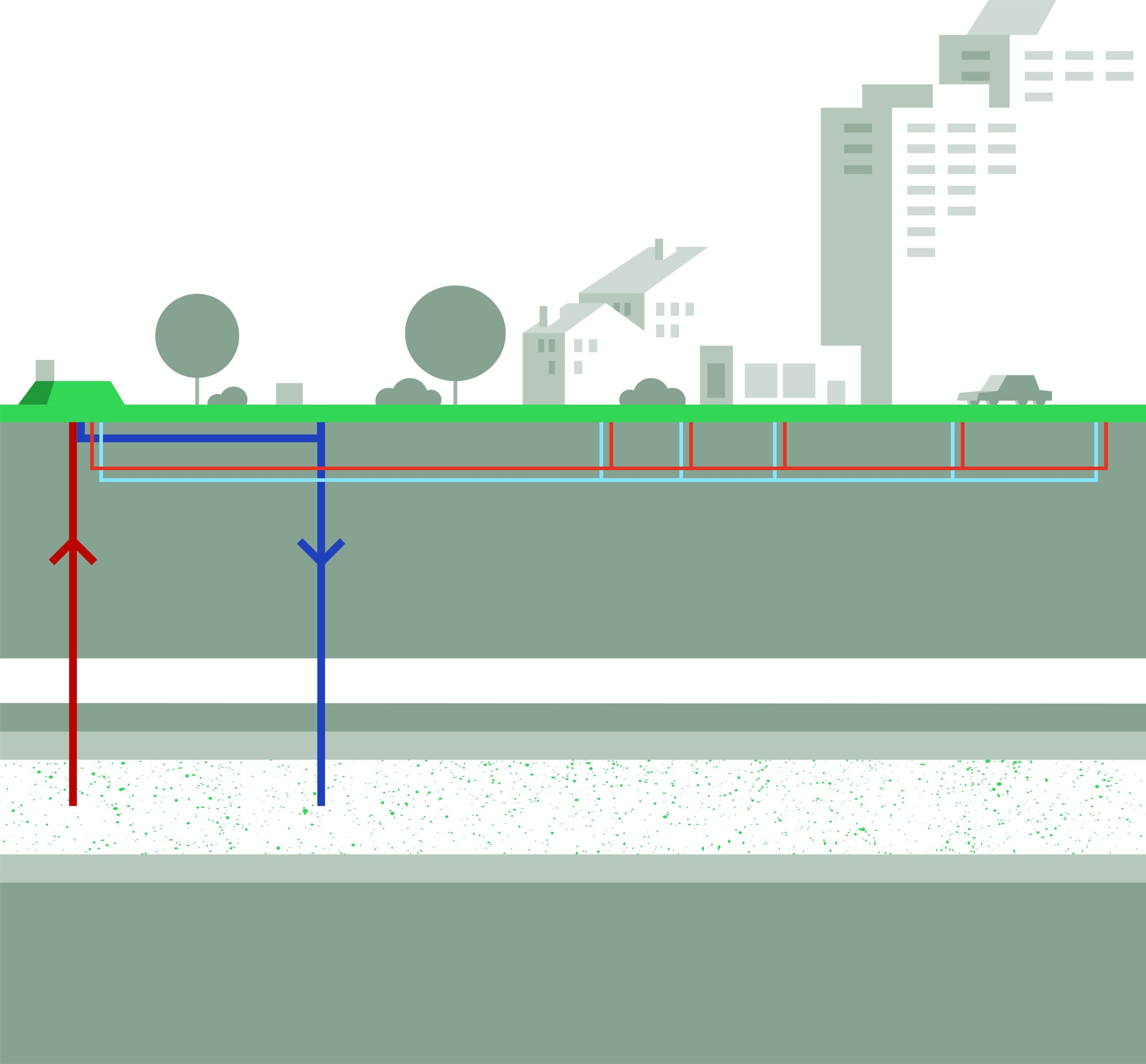 Geothermal energy originates from the earth’s core. In a location like Aarhus, water is extracted 2-3 kilometres below the surface at a temperature of 60-90 degrees C, via a production well. At surface, the water’s heat is then harvested via heat pumps and transferred to the district heating network, after which the cooled geothermal water is pumped back to the subsurface via an injection well. The technology offers the opportunity to provide a truly circular and sustainable form for energy.